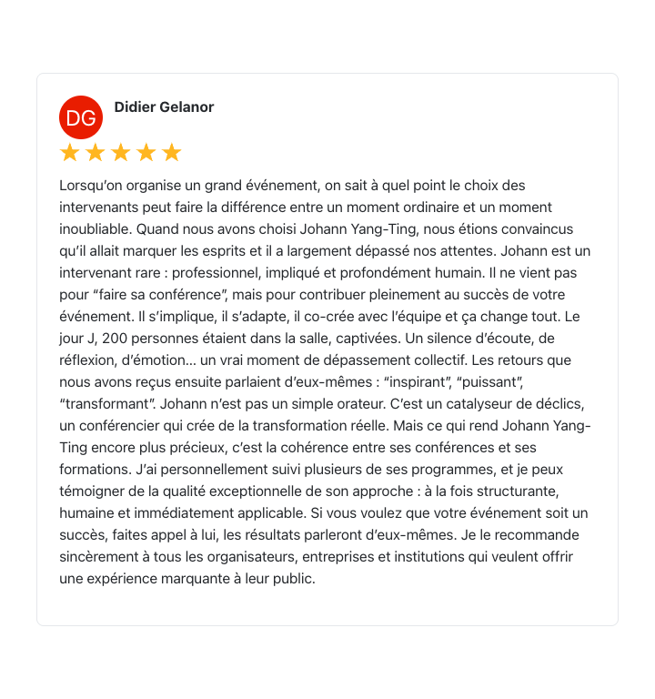Vous souhaitez booker Johann Yang-Ting pour une conférence ? Contactez-nous :